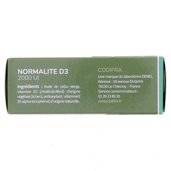 Normalite D3 2000 UI est un complément alimentaire sous forme de gouttes indiqué pour contribuer au fonctionnement normal du système immunitaire, au maintien d'une ossature normale, à la croissance et au développement osseux normaux des enfants.