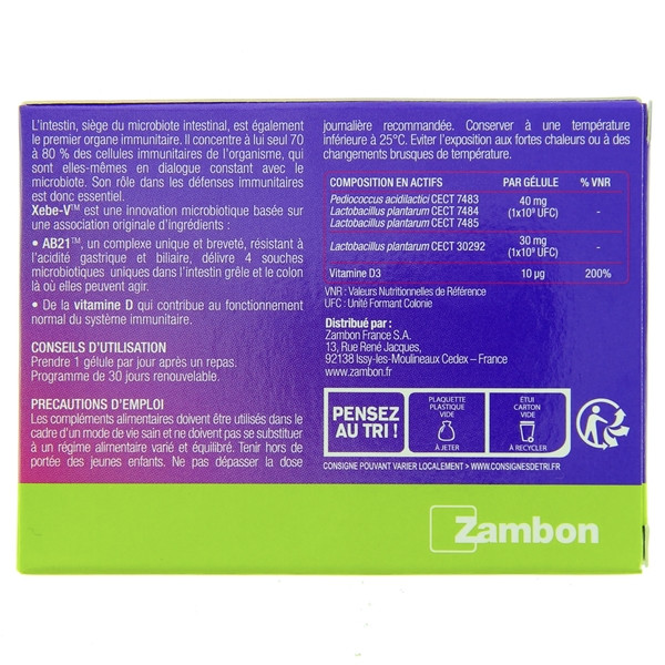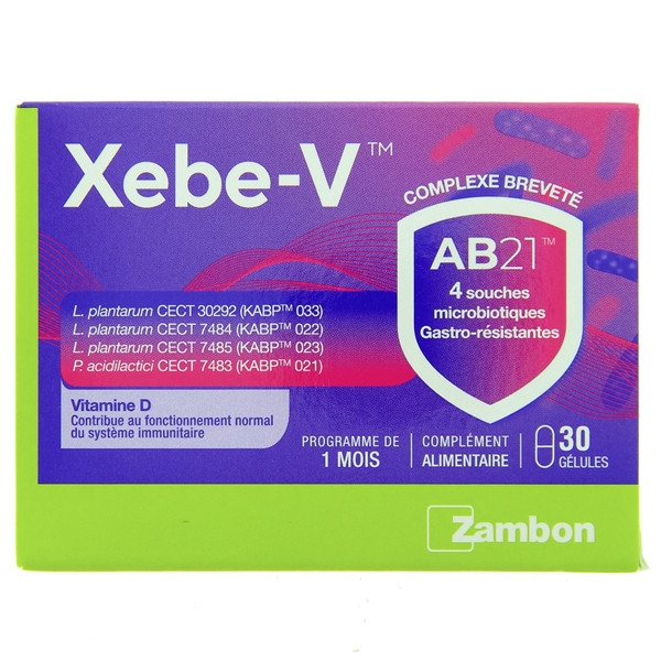 Xebe-V est un complément alimentaire développé par le laboratoire Zambon. Sa formule à base de 4 souches microbiotiques et de vitamine D est indiqué pour contribuer au fonctionnement normal du système immunitaire.