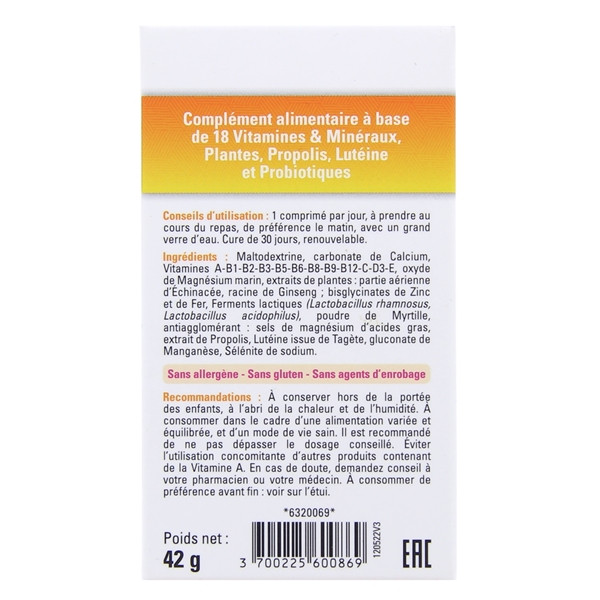 Maltodextrine, carbonate de calcium, vitamines A-B1-B2-B3-B5-B6-B8-B9-B12-C-D3-E, oxyde de magnésium marin, extraits de plantes : partie aérienne d’Échinacée, racine de Ginseng, bisglycinates de zinc et de fer, ferments lactiques (Lactobacillus rhamnosus, Lactobacillus acidophilus), poudre de Myrtille, antiagglomérant : sels de magnésium d’acides gras, extrait de Propolis, lutéine issue de Tagète, gluconate de manganèse, sélénite de sodium.