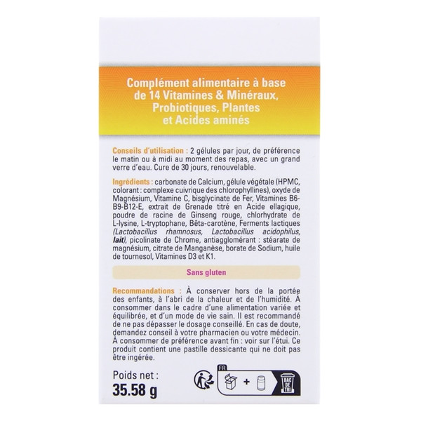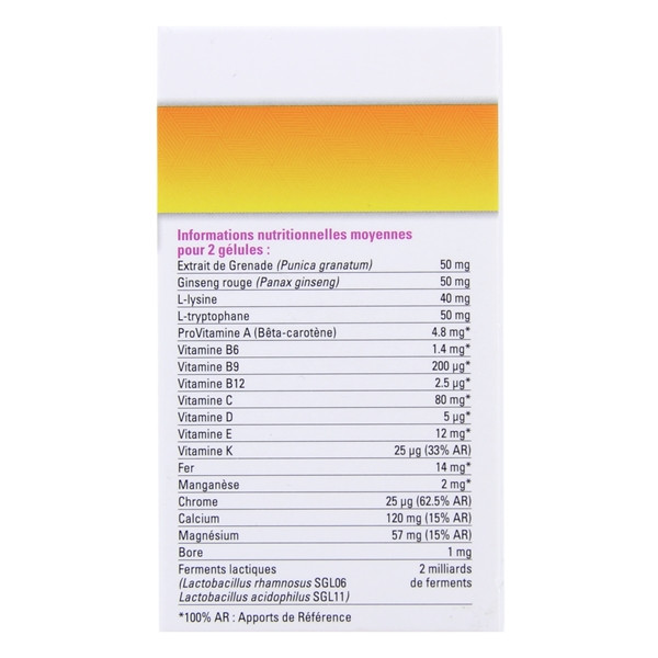 Carbonate de calcium, gélule végétale (HPMC, colorant : complexe cuivrique des chlorophyllines), oxyde de magnésium, vitamine C, bisglycinate de fer, vitamines B6-B9-B12-E, extrait de grenade titré en acide ellagique, poudre de racine de ginseng rouge, chlorhydrate de L-lysine, L-tryptophane, bêta-carotène, ferments lactiques (lactobacillus rhamnosus, lactobacillus acidophilus, lait), picolinate de chrome, anti-agglomérant : stéarate de magnésium, citrate de manganèse, borate de sodium, huile de tournesol, vitamines D3 et K1.