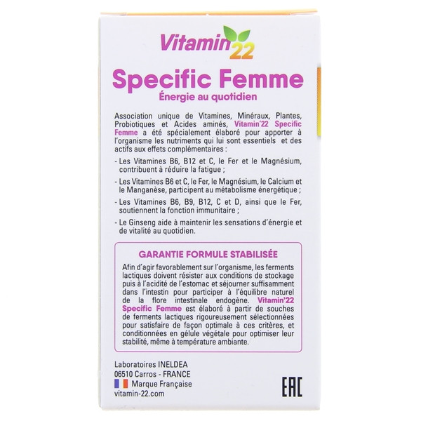 Vitamin' 22 Specific Femme répond aux besoins spécifiques de la gente feminine. Elle associe 14 vitamines, minéraux, probiotiques, plantes et acides aminés pour offrir un soutien complet à l’organisme.