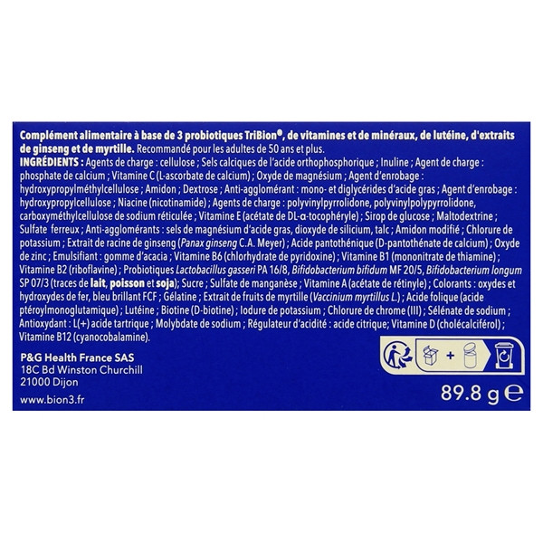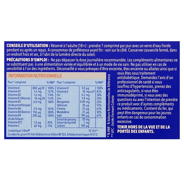 Agent de Charge : Cellulose ; Phosphate de Calcium ; Inuline ; Ascorbate de Calcium ; Oxyde de Magnésium ; Agent d’Enrobage : Hydroxypropylméthylcellulose ; Acétate de DL-a-Tocophéryle (Amidon modifié, Maltodextrine) ; Préparation de Ferments Tri-Bion (Dextrine, Amidon de Maïs, Lactobacillus Gasseri PA 16/8 Bifidobacterium Bifidum MF 20/5, Bifidobacterium Longum SP 07/3. Peut contenir des traces de protéines de lait, de poisson, de soja et de phénylalanine), Glucose ; Anti-Agglomérants : Mono- et Diglycérides d’Acides Gras (d’origine végétale) ; Extrait de Racine de Ginseng (Panax Ginseng), Nicotinamide, Agent de Charge : Polyvinylpyrrolidone ; Agent d’Enrobage : Hydroxypropylcellulose, Sulfate de Fer ; Agent de Charge : Polyvinylpolypyrrolidone ; Acétate de Rétinyle (Amidon de Maïs) ; Anti-Agglomérant : Sels de Magnésium d’Acide Gras (Origine Végétale) ; Chlorure de Potassium ; D-Pantothénate de Calcium ; Oxyde de Zinc ; Agent de Charge : Carboxyméthylcellulose de Sodium Réticulée ; Sélénate de Sodium ; Cholécalciférol (Saccharose, Amidon de Maïs, Huile de Palme) ; Chlorhydrate de Pyridoxine ; Colorants : Oxyde de Fer, Bleu Brillant FCF ; Mononitrate de Thiamine ; Lutéine (Gélatine, Saccharose, Huile de Palme) ; Riboflavine ; Anti-Agglomérant : Dioxyde de Silicium ; Sulfate de Manganèse ; Cyanocobalamine ; Extrait de Myrtille (Vaccinium Myrtillus) ; Acide Folique ; Biotine ; Iodure de Potasium ; Chlorure de Chrome ; Molybdate de Sodium.