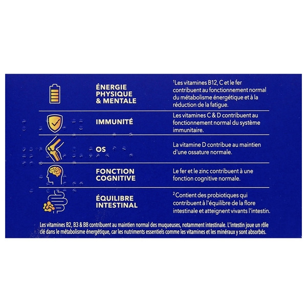 Ce supplément alimentaire se compose d’une formule contenant 12 vitamines essentielles, 7 minéraux et 3 souches probiotiques exclusives. Ces actifs assurent des actions efficaces pour renforcer l’énergie physique et mentale. Ils permettent notamment de réduire la fatigue tout en soutenant la fonction cognitive et le système immunitaire.