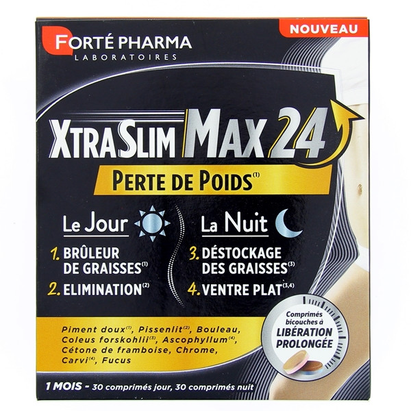 XtraSlim Max 24 est un complément alimentaire pour favoriser la perte de poids avec 4 actions ciblées réparties le jour et la nuit. Sa formule a été développée avec une association de 10 ingrédients pour agir sur les graisses, l'élimination et obtenir un ventre plat.