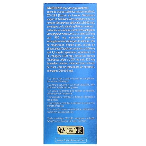 Agent de charge (cellulose microcristalline), OXY-288 [extrait de haricot (Phaseolus vulgaris L.), d’olivier (Olea europaea L.) et de romarin (Rosmarinus officinalis L.)] (500 mg), enveloppe de la gélule (gélatine, colorant : carbonate de calcium), extrait d’ascophyllum (Ascophyllum nodosum (L.) Le Jolis) (225 mg soit 900 mg équivalent plante), antiagglomérants (dioxyde de silicium, sels de magnésium d’acide gras), extrait de piment doux (Capsicum annuum L.) (140 mg soit 1,4 mg de capsaïcine), vitamines (C et E), collagène (100 mg), extrait de sureau (Sambucus nigra L.) (45 mg soit 225 mg équivalent plante), minéraux [zinc (citrate de zinc), chrome (picolinate de chrome)], coenzyme Q10 (10 mg).