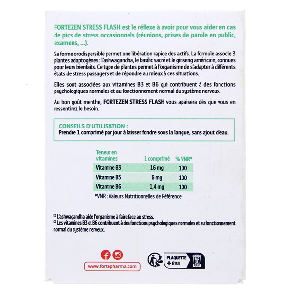 Forté Zen Stress Flash aide à réduire le stress rapidement. Il s’agit d’un complément alimentaire contenant des ingrédients naturels. Chaque boîte est composée de 10 comprimés orodispersibles parfumés à la menthe.
