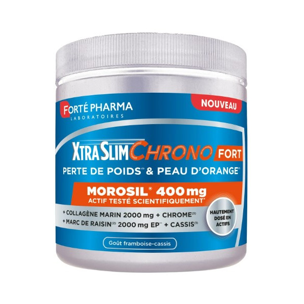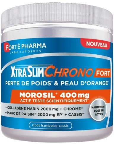 XtraSlim Chrono Fort Morosil des laboratoires Forté Pharma est un complément alimentaire qui associe du Morosil, du Collagène Marin, du Chrome, du Marc de Raisin et du Cassis pour contribuer à la perte de poids et aider à lutter contre la peau d'orange.