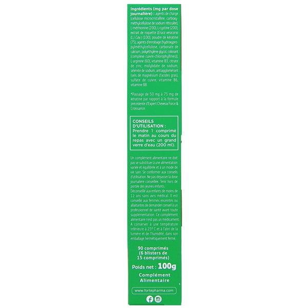 L’exposition quotidienne aux agressions extérieures fragilise la fibre capillaire et entraîne la sécheresse et la casse des cheveux tout en ralentissant leur croissance. Pour prévenir ces effets néfastes, Forté Pharma a développé Expert Cheveux Force & Croissance, un complément alimentaire permettant de renforcer la fibre capillaire et de favoriser sa pousse. Ce produit riche en vitamines et en minéraux aide à revitaliser les cheveux abîmés et à stimuler leur croissance et leur résistance.