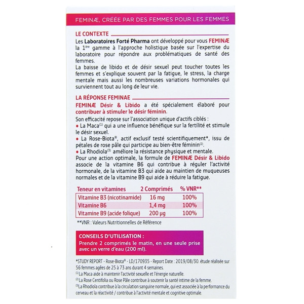 Feminae Désir & Libido des laboratoires Forté Pharma est un complément alimentaire spécialement développé pour contribuer à stimuler le désir féminin.