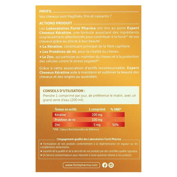 Forté Pharma Expert Cheveux Kératine contient 3 actifs phares : la kératine, les protéines de riz et du zinc. La kératine, une matière naturelle constituant la majeure partie de la fibre capillaire, exerce un rôle primordial pour garantir la force, l’éclat et la résistance des cheveux. Ce composant est connu pour ses vertus fortifiantes qui améliorent la structure des cheveux abîmés, cassants ou fins. Les protéines de riz apportent des acides aminés pour soutenir les actions de la kératine. Le zinc représente un oligo-élément essentiel pour conserver des cheveux normaux et prémunir les cellules du stress oxydatif. Ce complément alimentaire fournit à la chevelure les nutriments nécessaires pour préserver sa beauté. Conditionnement : boîte de 30 comprimés.