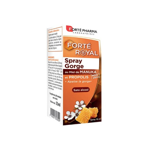 Forté Royal Spray Gorge Miel Manuka 15ml des laboratoires Forté Pharma a été développé pour contribuer à l’apaisement des gorges irritées ou sensibles. La formule douce et naturelle de ce complément alimentaire contient du miel toutes fleurs, du miel de Manuka, de la propolis et de la camomille.