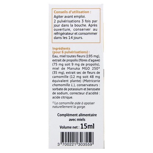 Eau, miel toutes fleurs, extrait de propolis (fibres d’agave), miel de Manuka MGO* 250, extrait sec de fleurs de camomille (Matricaria chamomilla L.), conservateurs : sorbate de potassium, benzoate de sodium, correcteur d'acidité : acide citrique.