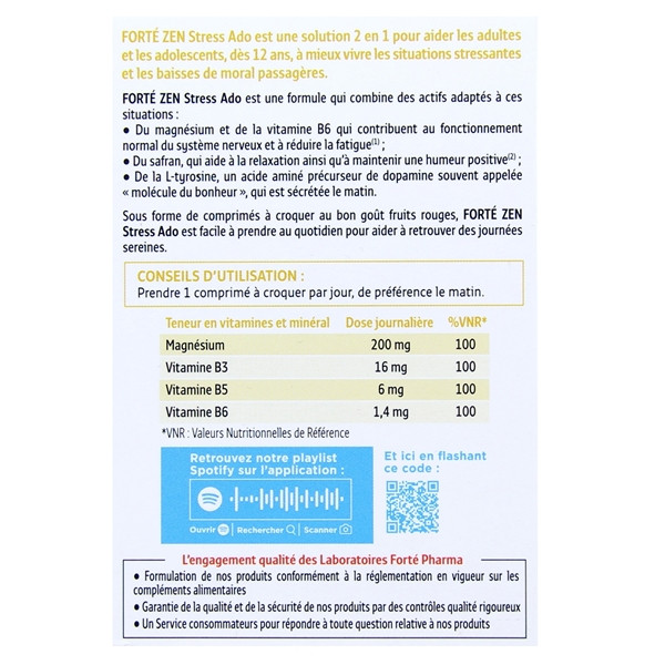 Forté Zen Stress Ado des laboratoires Forté Pharma est un complément alimentaire 2 en 1 qui aide les adolescents (dès 12 ans) et les adultes à mieux gérer les situations de stress ainsi que les baisses de morales passagères.