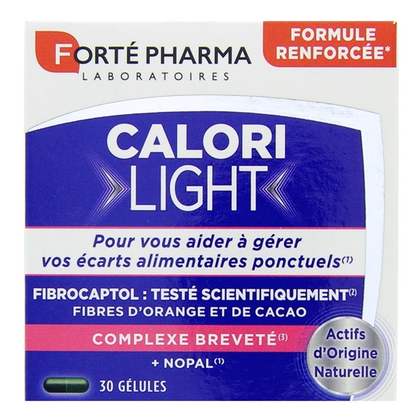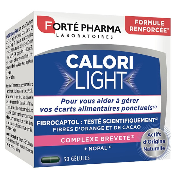 L’efficacité de Forté Pharma CaloriLight repose sur un ingrédient exclusif et breveté, le Fibrocaptol, qui associe des fibres de cacao et des fibres d’orange dont les vertus lipo-absorbantes ont été testées et démontrées scientifiquement. Cette supplémentation contient aussi du nopal, une plante plus connue sous l’appellation de « figuier de Barbarie », qui aide à maîtriser le poids en diminuant l’appétit et par conséquent l’apport calorique lors d’un écart alimentaire. Ce composant renforce les actions du Fibrocaptol. Ce produit est disponible en boîte de 30 gélules sous format mini-blisters de 6 gélules pouvant être emportées discrètement partout. Ce complément alimentaire est passé par un contrôle qualité rigoureux avant d’être proposé au public.