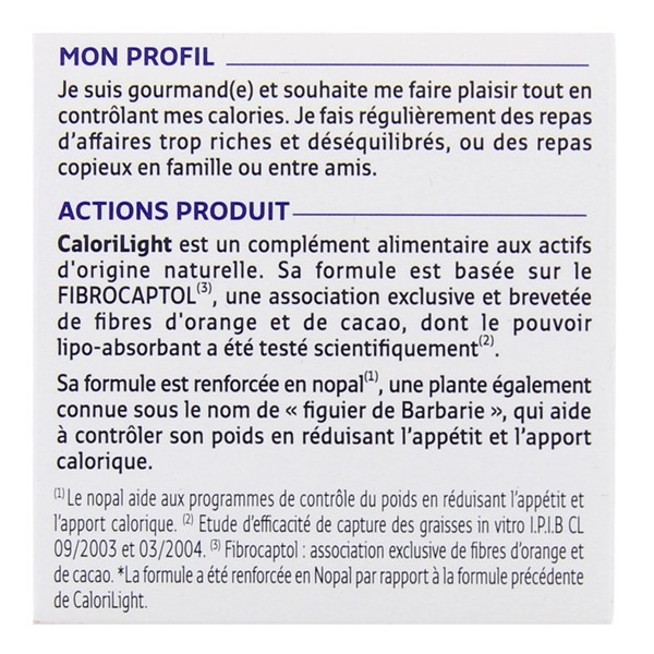 CaloriLight est une aide-minceur destinée aux gourmand(e)s qui souhaitent garder la ligne ou à tous ceux qui font régulièrement des repas d'affaires ou de fêtes. Ses actifs d'origine naturelle permettent de contrôler l'apport calorique de vos repas.