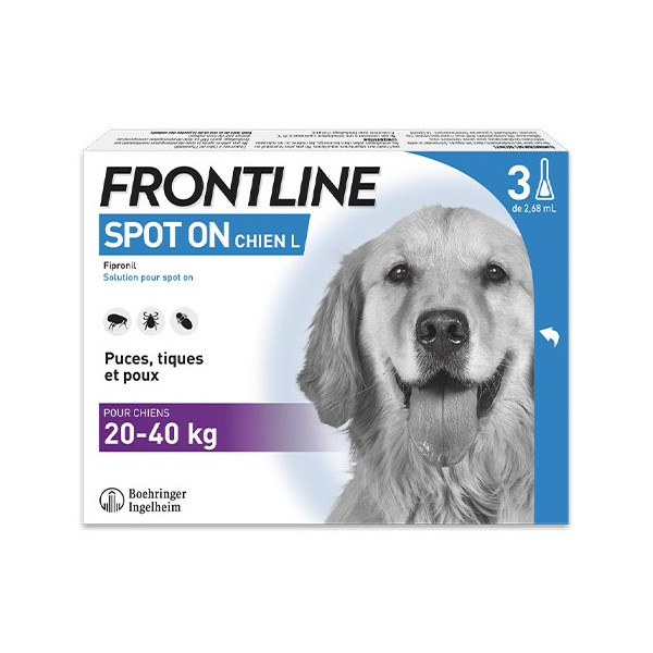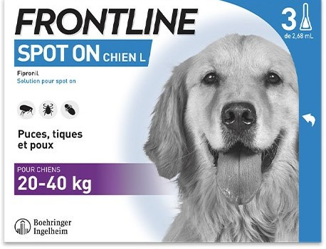 Frontline Spot-on Chien L est indiqué chez les chiens et chiennes de grande taille, entre 20 et 40 kg, dans le traitement et l'élimination des puces, tiques et poux