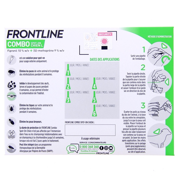 FRONTLINE Combo Chien L procure une protection complète contre les puces et les tiques. Il protège efficacement les chiens de grande taille pesant entre 20 et 40 kg. Une fois appliqué sur la peau de l’animal, FRONTLINE se concentre dans le sébum pour ensuite parvenir jusqu’aux les glandes sébacées.