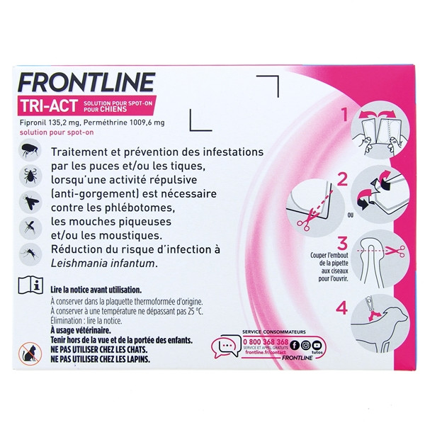 Réservé aux chiens de 10 à 20 kg, le Frontline Tri-Act M est une solution pour spot-on qui possède une triple action contre les parasites. En effet, ce produit les repousse, les tue et prévient leur infestation. Son effet radical cible 5 types de parasites : les puces, les tiques, les moustiques, les phlébotomes et les mouches piqueuses. Grâce à ses substances actives : le fipronil et la perméthrine, Frontline Tri-Act M agit rapidement en éliminant les puces adultes en 24 heures. Les nouvelles puces sont tuées en 6 heures et les tiques dans les 48 heures suivant l’application. En outre, il peut repousser les insectes volants comme les moustiques, les phlébotomes ou encore les mouches piqueuses. Sachez que c’est le seul antiparasitaire efficace pour éloigner les moustiques tigres.