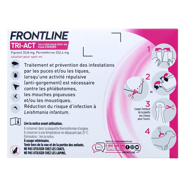 Tri-act Chien XS est fabriqué en France par Frontline. Cette marque est connue pour l’efficacité de ses traitements antiparasitaires conçus pour protéger les animaux de compagnie contre les désagréments ou les maladies transmises par les piqûres, comme la leishmaniose.