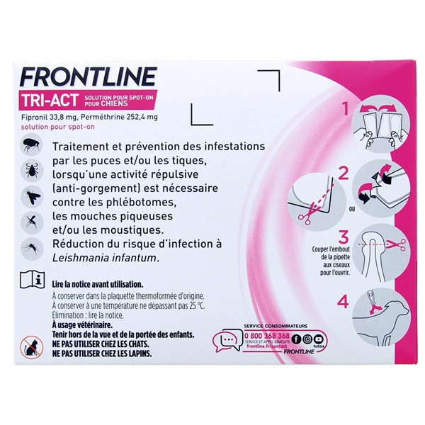 Tri-act Chien XS en boîte de 6 pipettes de 0,5ml est fabriqué en France par Frontline. Cette marque développe un panel complet de produits antiparasitaires adaptés au poids de chaque chien, allant des petits chiens de 2 à 5kg aux molosses de 40 à 60kg.