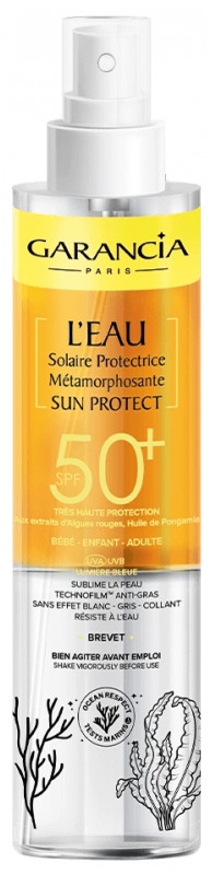 L'Eau Solaire Protectrice Métamorphosante Sun Protect SPF50+ du laboratoire Garancia offre une très haute protection contre les UVA/UVB ainsi qu'une action anti-oxydante. Cette eau solaire biphasée convient aux bébés, enfants, adultes et femmes enceintes.