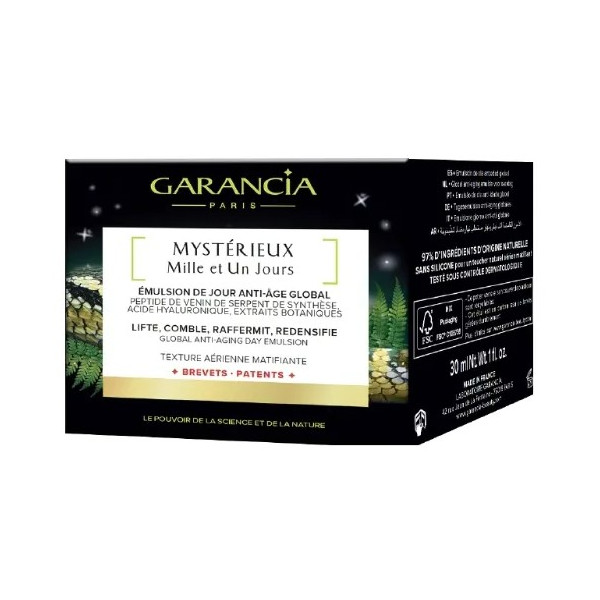 Mystérieux Mille et Un Jours Émulsion de Jour Anti-âge Global du laboratoire Garancia est un soin complet 4 en 1 : elle diminue l'apparence des rides, redensifie, raffermit et lifte visiblement la peau. Cette émulsion est idéale pour les peaux mixtes à grasses.