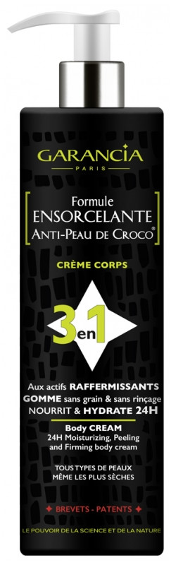 Formule Ensorcelante Anti-Peau de Croco 3 en 1 du laboratoire Garancia est une crème pour le corps aux actifs raffermissants, destinée à tous les types de peaux, même les plus sèches. Elle gomme sans grain et sans rinçage, nourrit et hydrate pendant 24 h la peau.
