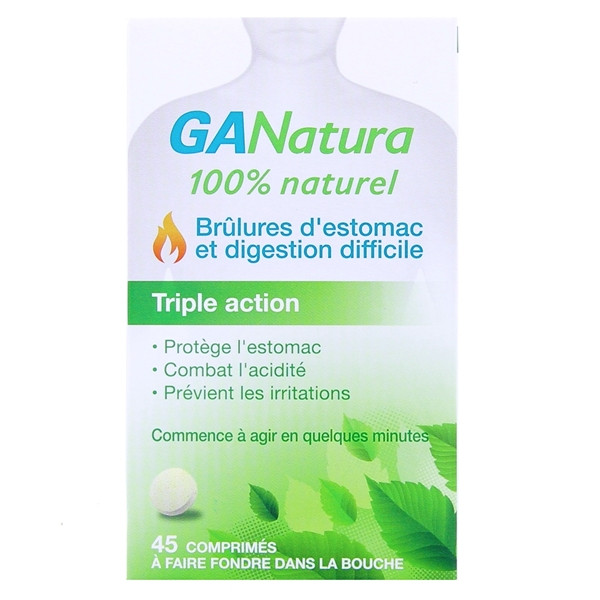 Les comprimés Gaviscon GANatura Triple Action Digestion Difficile & Brûlures d’Estomac agissent en quelques minutes grâce à la synergie des polysaccharides et des minéraux naturels qui composent son complexe moléculaire unique. Celui-ci exerce en même temps 3 bienfaits en cas de maux d’estomac. Il possède des propriétés muco-adhésives qui protègent la muqueuse gastrique. Il apporte un effet tampon qui inhibe l’acidité des sucs gastriques à l’origine des reflux gastro-oesophagiens et des brûlures d’estomac. Ce complexe breveté permet également de prévenir les irritations. Composés à 100% d’ingrédients naturels, ces comprimés pratiquent un mécanisme d’action protecteur au niveau de l’œsophage et de l’estomac. Ils agissent ainsi sans empêcher la fonction gastrique. Conditionnement : flacon de 45 comprimés.
