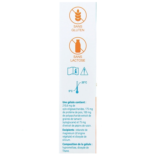 Une gélule contient : 210,6 mg de xylo-oligosaccharides, 175 mg de protéine de pois, 100 mg de polysaccharide extrait de graines de tamarin (xyloglucane), 75 mg d'extrait de pépins de raisin - excipients : stéarate de magnésium (d'origine végétale), dioxyde de silicium – gélule : hypromellose, dioxyde de titane.