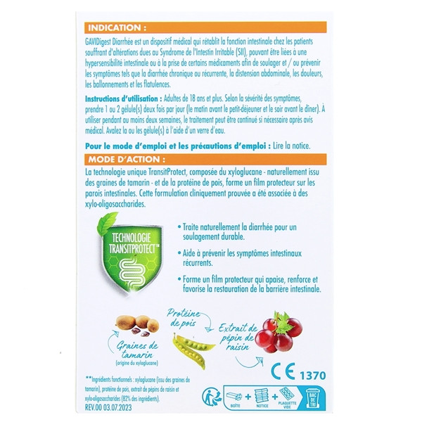Gaviscon GAVIDigest Diarrhée est doté d’une technologie brevetée : TransitProtect. Ce composant unique a été élaboré à partir de protéines de pois et de graines de tamarin, une source de xyloglucane. La synergie de ces ingrédients agit sur la cause de l’altération de la muqueuse intestinale à l’origine des symptômes du SII. De l’extrait de pépins de raisin et des xylo-oligosaccharides complètent la formule pour permettre de soigner de manière naturelle la diarrhée chronique ou récurrente et apporter un soulagement sur la durée. Ce dispositif se révèle efficace dans le cadre de la prévention des pathologies intestinales itératives en déposant un film protecteur qui apaise, renforce et stimule la restauration de la barrière intestinale. Conditionnement : boîte de 30 gélules.