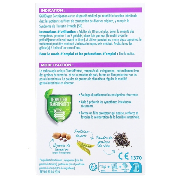 Les gélules Gaviscon GAVIDigest permettent d’atténuer les symptômes de la constipation répétitive en rétablissant la fonction normale des intestins chez les sujets souffrant de cette pathologie. Elles soulagent rapidement et de manière durable les douleurs. Les performances de ce dispositif reposent sur sa formule qui intègre le complexe breveté TransiProtect. Celui-ci contient du xyloglucane extrait du tamarin et de la protéine de pois qui oeuvrent en synergie pour recouvrir les parois intestinales d’une couche protectrice. À ces ingrédients s’ajoute de la poudre de chia qui contribue à la normalisation de la mobilité gastro-intestinale. Ce produit de soin exerce une action ciblée en intervenant directement au niveau du système digestif pour réguler le transit intestinal et amenuiser les sensations d’inconfort. Conditionnement : boîte de 60 gélules.