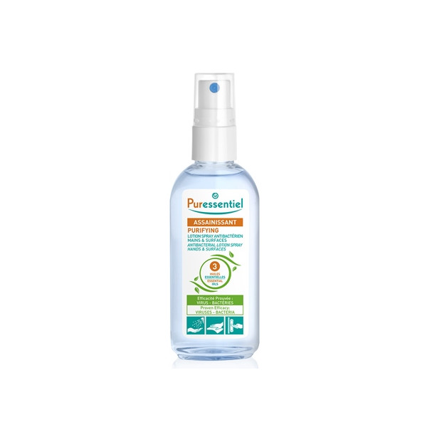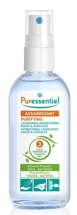 Des laboratoires Puressentiel, la lotion Spray Antibactérien Assainissant est une solution hydroalcoolique sans rinçage servant à désinfecter les mains et les petites surfaces. Il nettoie et assainit sans eau et sans savon les poignées de porte, les écrans de téléphone, les claviers, les volants de voiture et toutes surfaces susceptibles de constituer un nid à microbes, virus et bactéries.