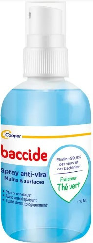 Le Spray Anti-Viral Désinfectant Fraîcheur Thé Vert de la marque Baccide est un spray hydroalcoolique avec un agent apaisant. Il est indiqué pour la désinfection des mains et des surfaces. Ce spray convient aux peaux sensibles.