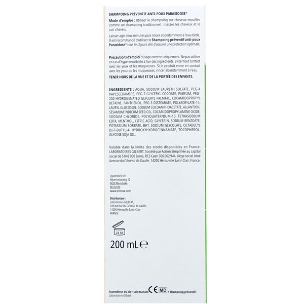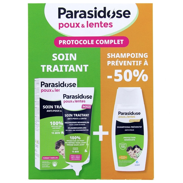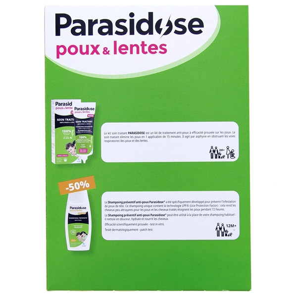 Le kit de traitement anti-poux Parasidose contient 1 soin traitant anti-poux et lentes de 200 ml et 1 shampoing préventif de 200 ml avec - 50 % offert. Ce duo regroupe deux essentiels pour éliminer efficacement et durablement les poux et lentes.