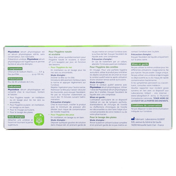 Des laboratoires Gilbert, le sérum physiologique Physiodose stérile végétal est une solution saline à utiliser chez les nourrissons et les enfants. Éventuellement, il convient également à l’adulte.