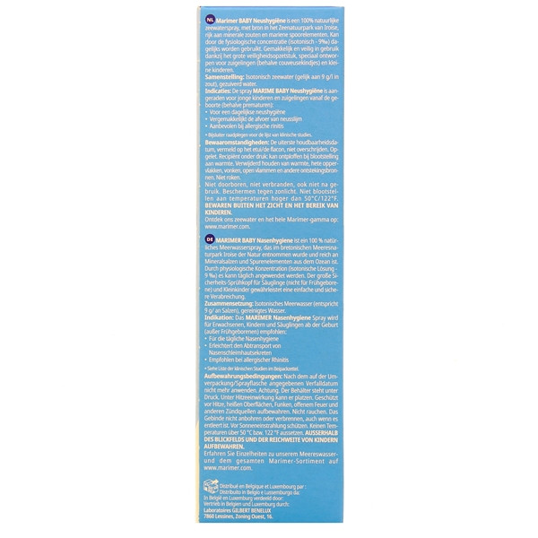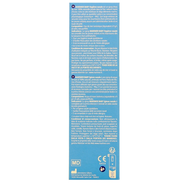 Marimer Baby Hygiène nasale quotidienne est un spray d'eau de mer 100 % naturelle pour nettoyer et évacuer efficacement et en douceur les sécrétions nasales des nourrissons et des jeunes enfants. De plus, il aide à prévenir les infections ORL.