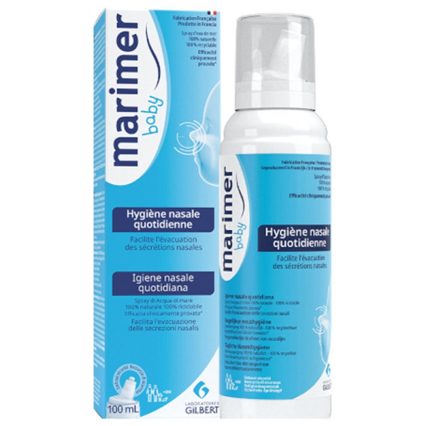Marimer Baby Hygiène Nasale Quotidienne 100 ml est un produit efficace pour nettoyer les fosses nasales des jeunes enfants et des nourrissons. D’ailleurs, ce soin simplifie l’évacuation des sécrétions nasales. Il est formulé sans conservateur et se compose essentiellement d’eau de mer 100 % naturelle, un actif très riche en oligo-éléments marins et en sels minéraux. C’est donc le produit idéal pour prévenir les rhumes et les rhinites. Son utilisation donne aussi la possibilité de restaurer l’hydratation des nez secs des petits enfants et de régénérer leur muqueuse nasale.