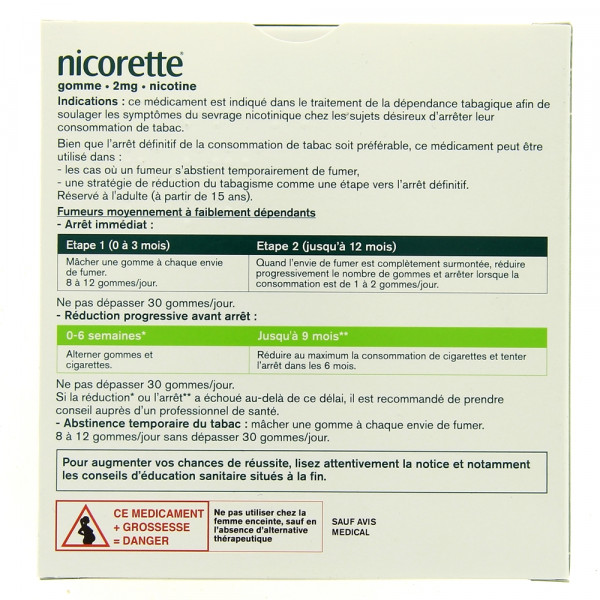- Arrêt complet du tabac : dans cet objectif, le traitement de la dépendance à la nicotine suit habituellement 2 phases : pendant 3 mois, mâcher une gomme à chaque fois que le besoin de fumer se fait sentir, sans dépasser 30 gommes à 2 mg ou 15 gommes à 4 mg par jour. Cette période de 3 mois peut varier d'une personne à l'autre et sa fin correspond à une forte diminution ou une disparition de l'envie de fumer. La deuxième phase, qui dure 6 à 8 semaines, correspond à une diminution progressive du nombre de gommes journalières, jusqu'à l'arrêt. Le traitement ne doit pas dépasser 6 mois au total.
