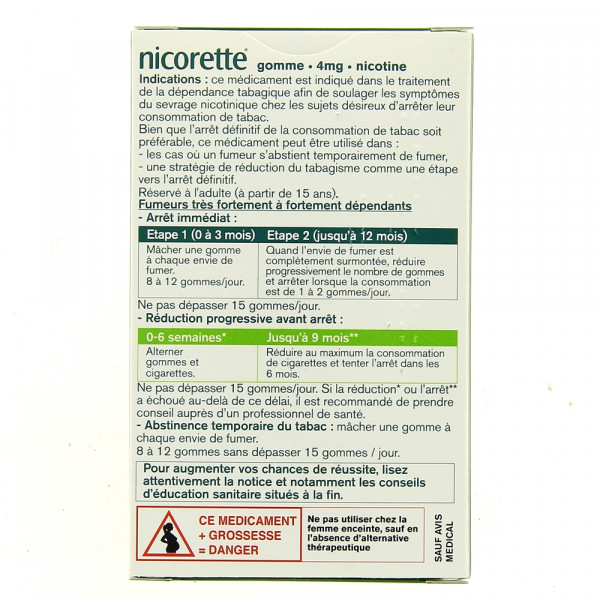 - Réduction de la consommation du tabac : mâcher une gomme dès que l'envie de fumer se fait sentir afin de réduire au maximum la consommation de cigarettes et rester aussi longtemps que possible sans fumer. Le nombre de gommes à utiliser par jour est variable mais ne doit pas être supérieur à 30 gommes à 2 mg ou 15 gommes à 4 mg. Si une forte diminution de la consommation de cigarettes n'a pas été obtenue après 6 semaines de traitement, il est recommandé de prendre conseil auprès d'un médecin. L'objectif de la réduction du nombre de cigarette est de parvenir à terme à un arrêt complet du tabac, qui devra être tenté le plus tôt possible, nécessairement dans les 6 premiers mois de traitement. Il n'est pas recommandé de poursuivre le traitement plus de 12 mois.