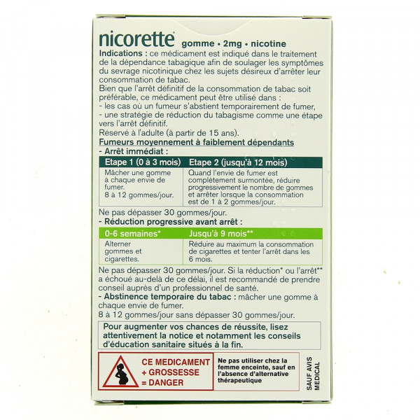 - Arrêt complet du tabac : dans cet objectif, le traitement de la dépendance à la nicotine suit habituellement 2 phases : pendant 3 mois, mâcher une gomme à chaque fois que le besoin de fumer se fait sentir, sans dépasser 30 gommes à 2 mg ou 15 gommes à 4 mg par jour. Cette période de 3 mois peut varier d'une personne à l'autre et sa fin correspond à une forte diminution ou une disparition de l'envie de fumer. La deuxième phase, qui dure 6 à 8 semaines, correspond à une diminution progressive du nombre de gommes journalières, jusqu'à l'arrêt. Le traitement ne doit pas dépasser 6 mois au total.