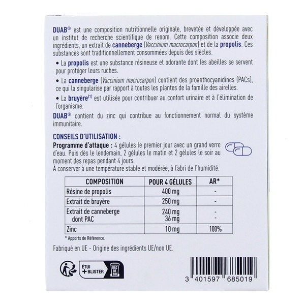 - La prise de DUAB® Confort Urinaire est déconseillée en cas d’intolérance alimentaire avérée aux produits issus de la ruche ou aux fruits rouges.