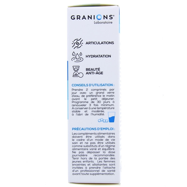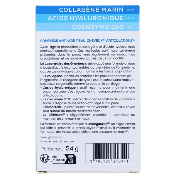 Collagène Marin, Acide hyaluronique & Coenzyme Q10 des laboratoires Granions est un complément alimentaire complet anti-âge qui agit sur la beauté de la peau et des cheveux, ainsi que sur le maintien d'une ossature normale.