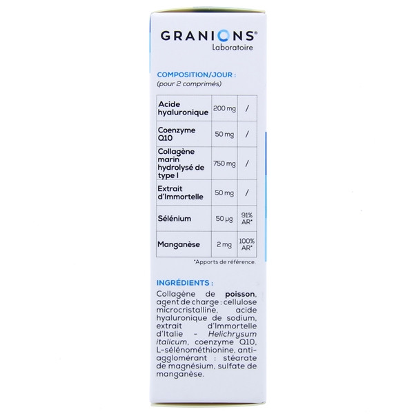 Collagène de poisson, agent de charge : cellulose microcristalline, acide hyaluronique de sodium, extrait d’Immortelle d’Italie - Helichrysum italicum, coenzyme Q10, L-sélénométhionine, antiagglomérant : stéarate de magnésium, sulfate de manganèse.