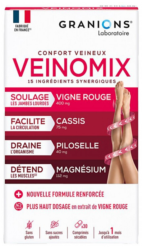 Veinomix Confort Veineux des laboratoires Granions est destiné à apporter légèreté, confort et bien-être aux jambes. Ce complément alimentaire se présente comme une solution complète associant les vertus de plantes, de vitamines et d’oligoéléments de haute qualité. Il se dote d’une formule efficace assurant diverses actions. En effet il permet d’améliorer la santé veineuse, de protéger contre le stress oxydatif et de garantir le bon fonctionnement musculaire tout en limitant la rétention d’eau.