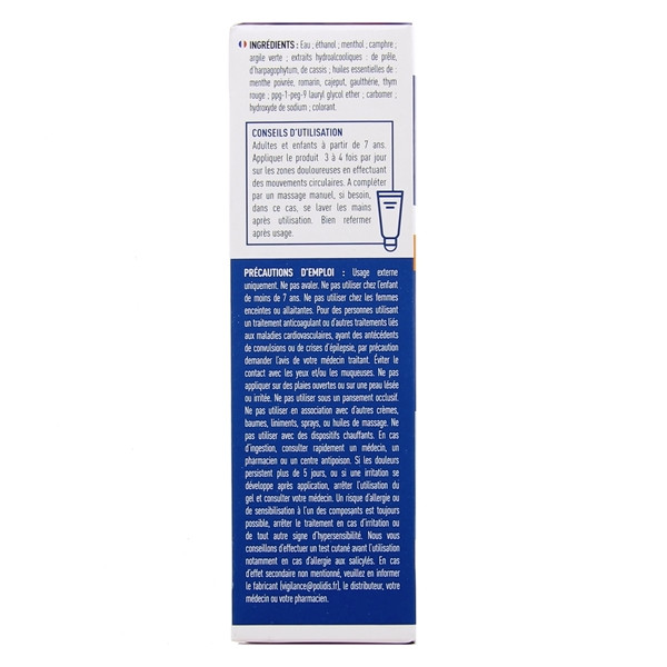 Eau?; éthanol?; menthol?; camphre?; argile verte?; extraits hydroalcooliques : de prêle, d’harpagophytum, de cassis?; huiles essentielles de : menthe poivrée, romarin, cajeput, gaulthérie, thym rouge?; ppg-1-peg-9 lauryl glycol ether; carbomer?; hydroxyde de sodium?; colorant.