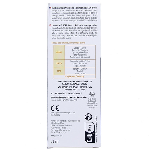 Chondrosteo Fort Articulations Roll-on Massage est un dispositif médical spécialement conçu par les laboratoires Granions. Il s’agit d’un laboratoire pharmaceutique avec pour valeurs fédératrices : l’innovation, l’excellence, la qualité, la transparence et le service aux médecins, pharmaciens et patients.