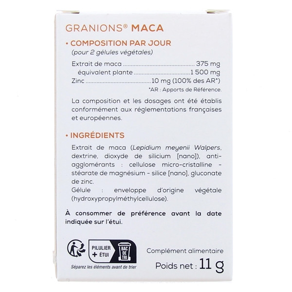 Granions Maca 375 mg est un complément alimentaire indiqué pour contribuer à stimuler le désir sexuel.