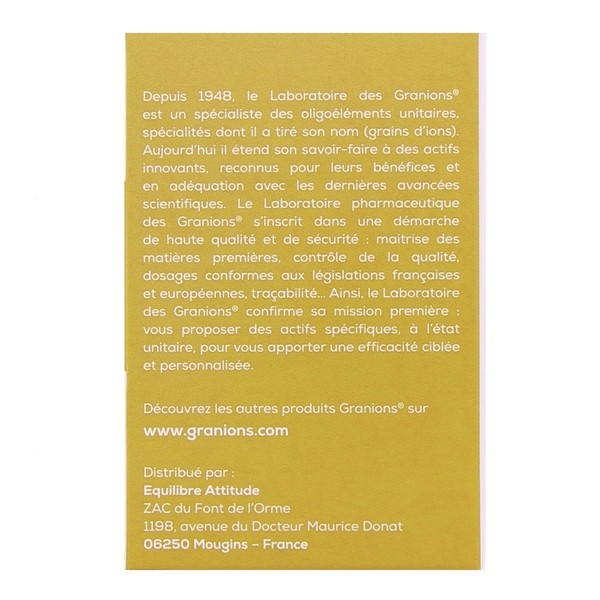 L’extrait de zinc participe aussi à l’efficacité de cette formule. De par sa propriété antioxydante, le zinc stimule le renouvellement cellulaire. Ainsi, il protège contre le vieillissement cutané. Issu du fameux laboratoire Granions, ce complément alimentaire est un produit 100 % français. Il est composé d’ingrédients d’origine naturelle et adaptés aux végans. Une boîte est constituée de 60 gélules végétales.