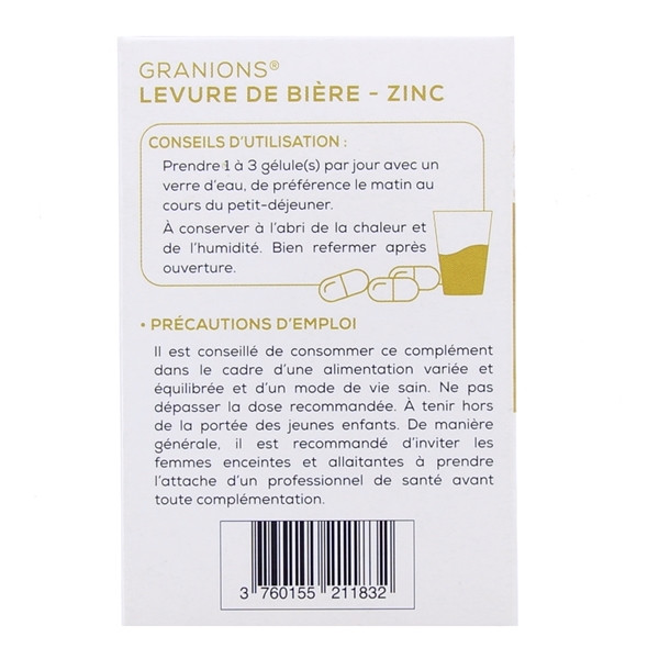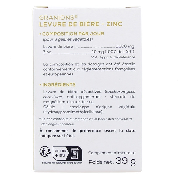 Granions Levure de bière est un complément alimentaire à base de levure de bière et de zinc. Il est indiqué pour contribuer au maintien normal de la peau, des ongles et des cheveux.