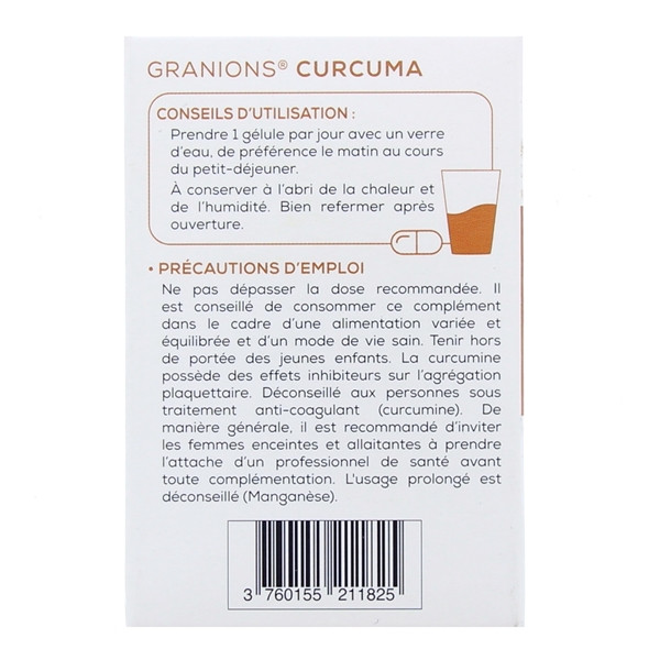 Granions Curcuma est un complément alimentaire qui peut être pris par toutes personnes adultes sauf avis médical contraire. La dose indiquée est de 1 à 2 gélules par jour, à prendre avec un verre d’eau ; idéalement le matin au cours du petit-déjeuner.